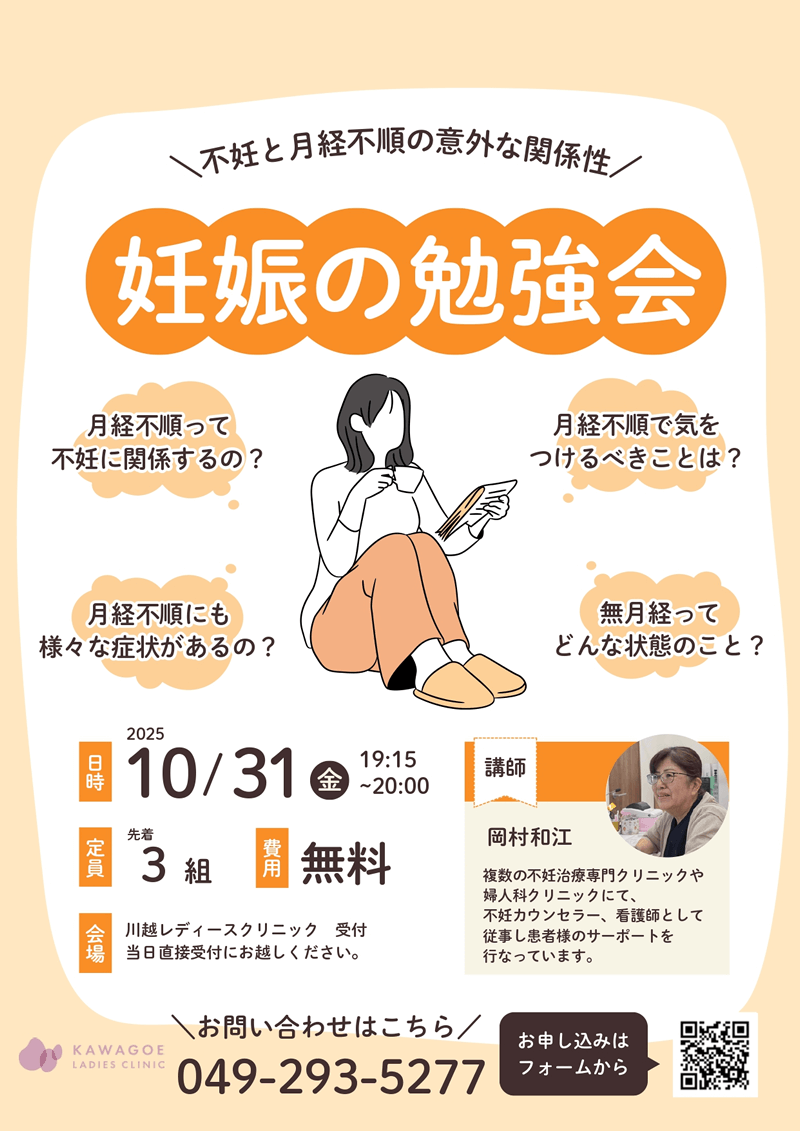 川越レディースクリニックでは、**ご好評につき不妊カウンセラーによる「妊娠の勉強会」**を10月も開催いたします。